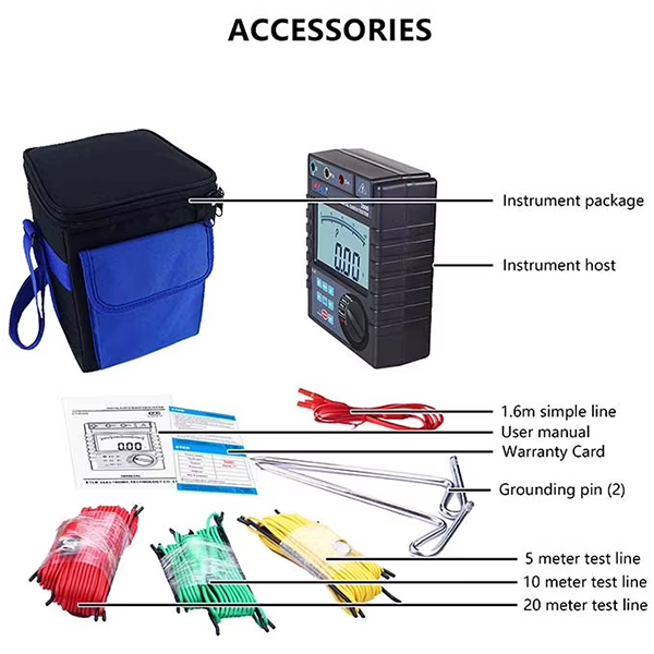 Tester: 1PC; Earth Rod: 2PCS; Testing Wire: 3PCS; Simple testing wire: 2PCS; Tester bag: 1PCS; Alkaline dry battery LR14 1.5V: 6 PCS