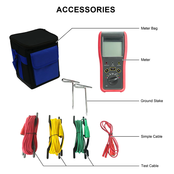 Tester:1PCS; Ground stake: 2PCS; Test line: 3PCS; Simple test line:1PCS; Tool bag:1PCS; LR6 battery: 6PCS